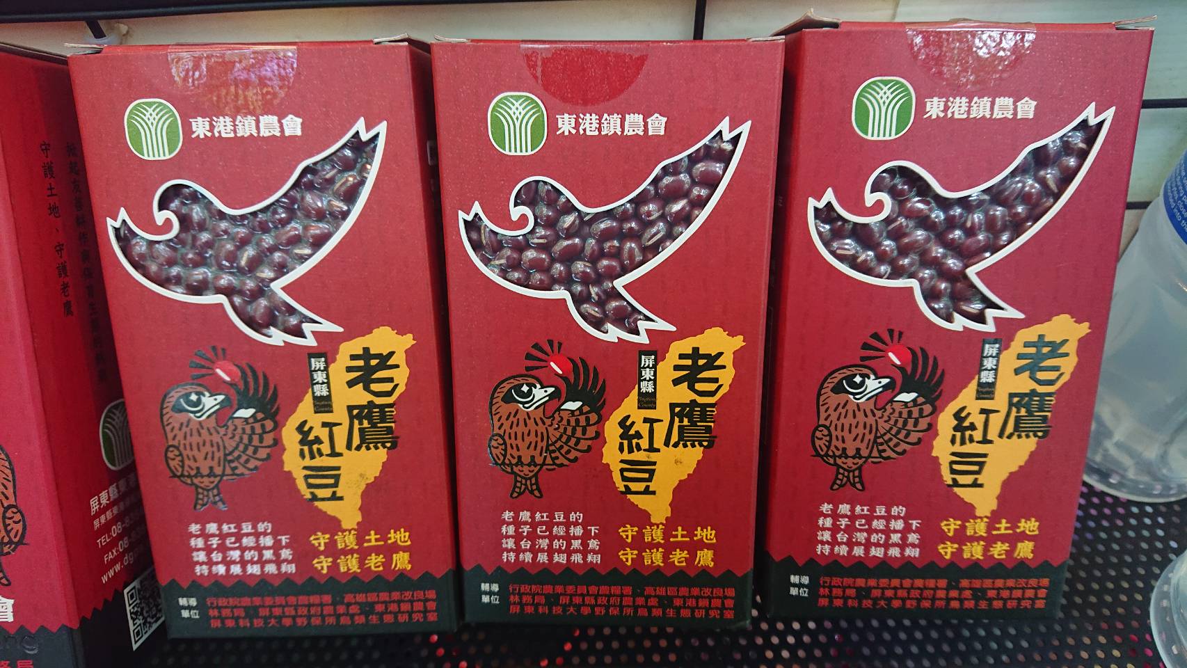 |東港鎮農會/老鷹紅豆|東港農會帶來的紅豆與紅豆冰沙。紅豆生產過程中,為了防止麻雀與斑鳩拉食幼苗,農民用浸泡過農藥的稻穀灑在田埂使鳥雀中毒,卻也讓獵食者老鷹連帶中毒死亡。在產官學各界與農友合作下,成立老鷹紅豆品牌,以契作方式提高農民收益、對生態食物鏈認識,生產不毒鳥、不用落葉劑、自然熟成的紅豆,給消費者安心享用。